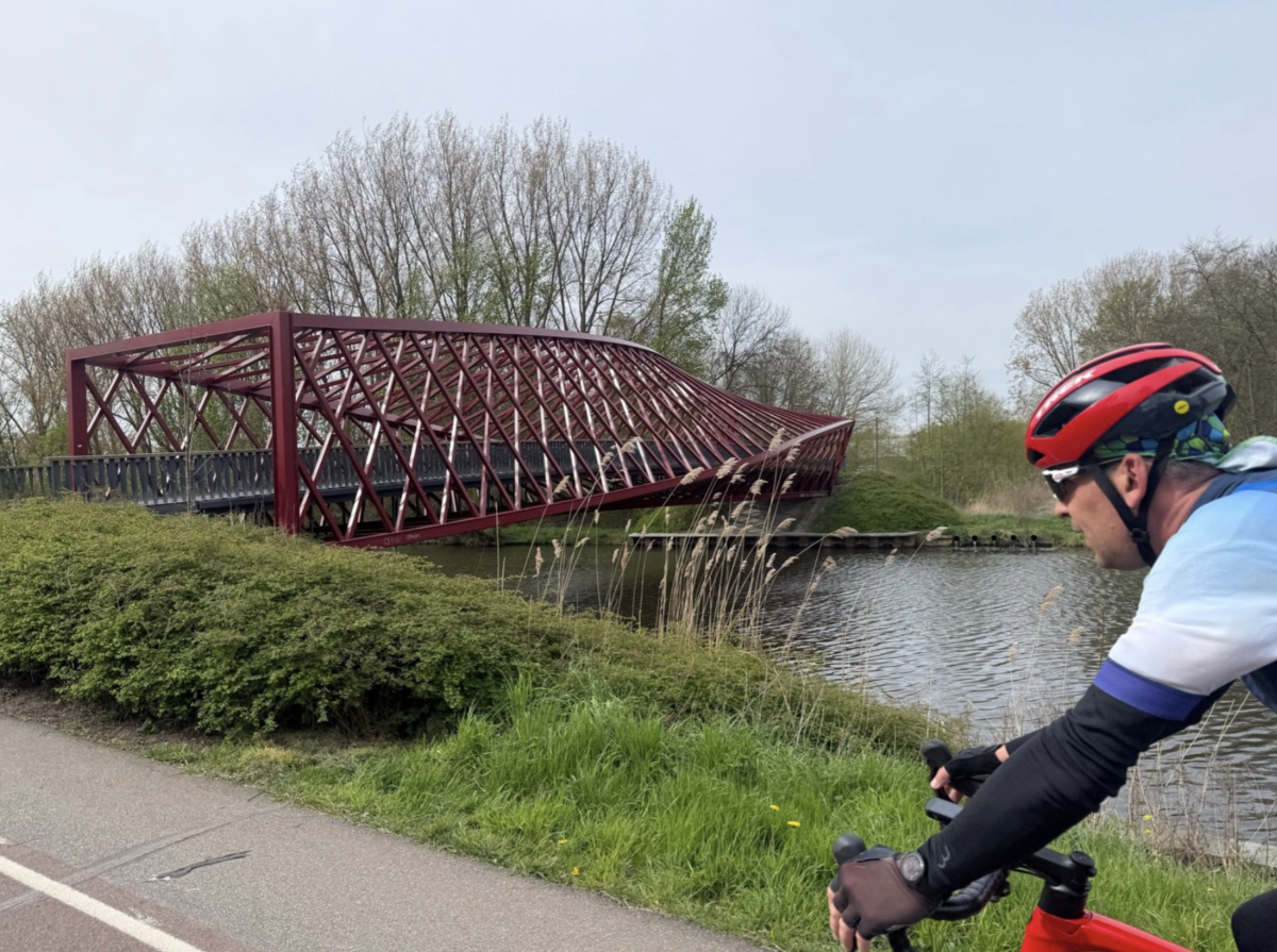 De route naar het doel van de reis voerde ons dit keer ‘met de klok mee’. Zo reden we eerst de Rotte (nagenoeg) uit. Vanuit Moerkapelle richting snelweg bleek van welke windkracht sprake was als deze in open veld vrij spel had. Met extra moeite bleef de groep bijeen, behalve toen Gerard en Ton er af wapperden. Hoewel in het geval van Ton het eerder een kwestie is van niet willen dan van niet kunnen. Hoofdschuddend van zoveel onbezonnen druistigheid rijdt de oud-voorzitter zijn eigen tempo en voegt zich met een veelzeggende glimlach bij de wachtende rest.
