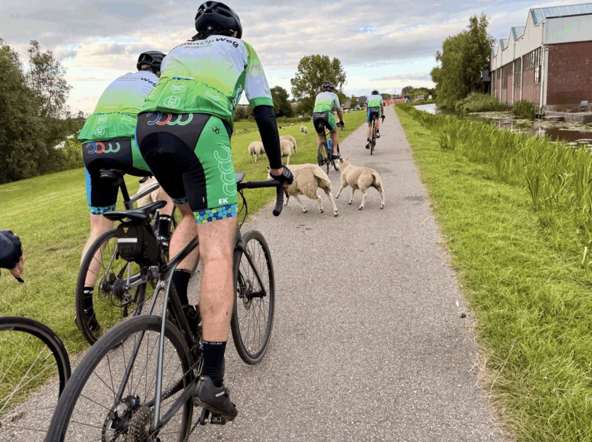 De wind zit nadrukkelijk in het noorden waarmee onze koersrichting is bepaald. Op de Côte de N’elf nestelt Aad zich op kop om daar samen met Thomas lange, lange tijd het vuile werk op te knappen. We passeren Nieuwkoop aan noordzijde per fietspad dat Hogedijk heet. Het is er druk met wandelaars, honden en schapen, dus het is opletten. Van het moment dat enkele van die wollen dames ons doodleuk negeren, weet natuurlijk Christian daar een plaatje van te schieten. Fijn dat onze fotograaf weer in ons midden is. Dat hij een hele fijne vakantie heeft gehad laat hij onze benen meermalen voelen deze avond.