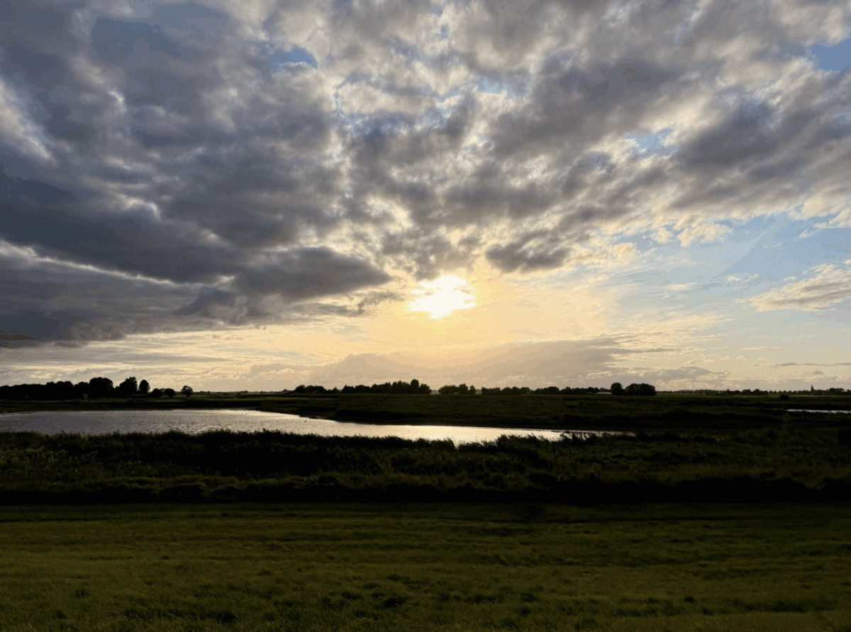 Als we Noorden naderen (daar waar deze avond de wind vandaan zou moeten komen) draaien we links weg en volgen we wat ook daar ‘Hogedijk’ heet. We duiken de Noordschebuurtpolder in, een prachtig wijds polderlandschap waar we – toch zo in de buurt – opmerkelijk weinig fietsen. We merken dat ook deze route naar De Hoef leidt waar we vol van de adrenaline ongeduldig voor een rood stoplicht hebben te wachten. Eenmaal het groen gezien hebbend, kronkelen we mee met de Kromme Mijdrecht met z’n vele onoverzichtelijke bochtjes. Het is deze avond helemaal opletten omdat de lui onderuit hangende zon ons meermalen verblindend recht in de ogen schijnt.