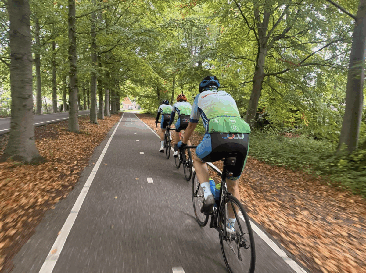 Na het infietsen á deux richting Stompwijk bleek niets minder waar. Het was Thijs die er over de hobbelige en verzakte klinkerweg langs de Stompwijkse Vaart een moordend temp op zette. Het was de verslaggever met (nog te veel) croissants in de benen die van achter de groep nog maar net kon aanhaken. Kilometers lang werd er op kop gesleurd, aangekomen bij de Driemanspolder werden er ‘stande pede’ kudo’s en tik-em-aan vuisten uitgedeeld aan TK voor de gedane arbeid. Wat de combi fietsen en hardlopen al niet teweeg kan brengen, Respect!!